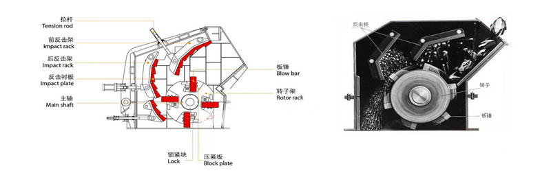 石料由機器上部直接落入高速旋轉的轉盤;在高速離心力的作用下,與另一部分以傘型方式分流在轉盤四周的飛石產生高速碰撞與高密度的粉碎,石料在互相打擊后,又會在轉盤和機殼之間形成渦流運動而造成多次的互相打擊、摩擦、粉碎,從下部直通排出。形成閉路多次循環,由篩分設備控制達到所要求的粒度。